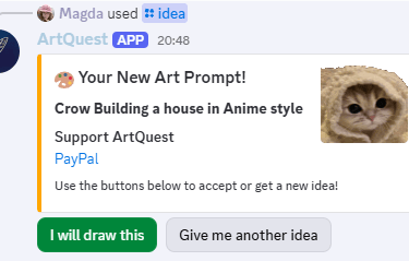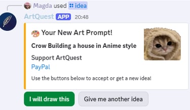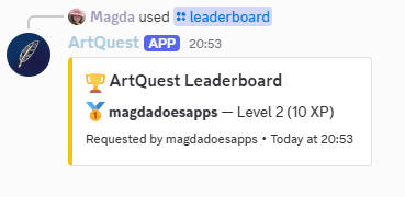ArtQuest is a creative Discord bot designed to inspire artists and connect communities. Generate art ideas, submit your drawings, earn XP, unlock roles, and compete on leaderboards — all through fun, interactive slash commands.