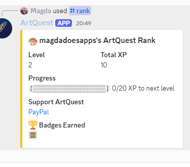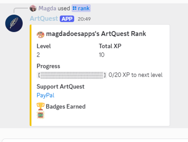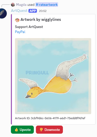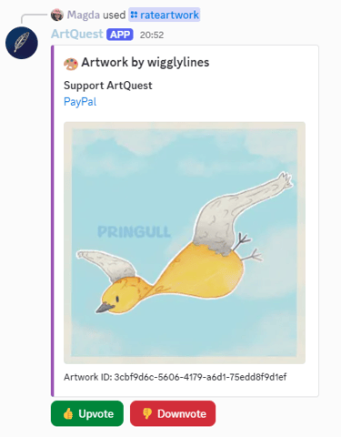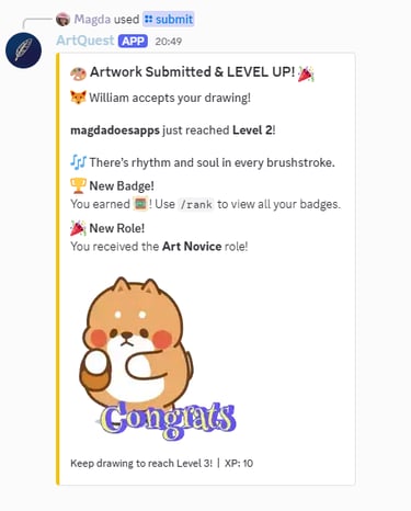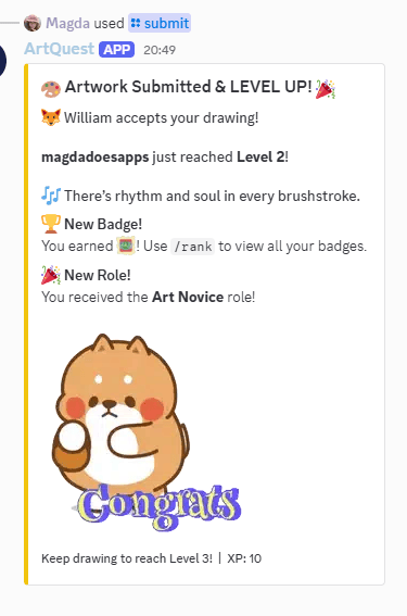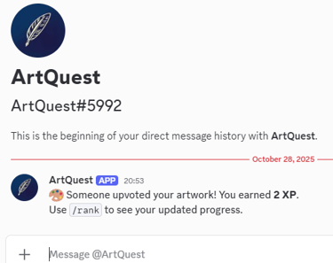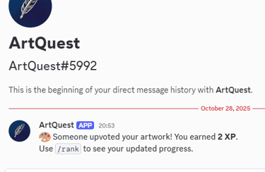 When you share artwork using /shareartwork, other users can rate it through /rateartwork. Each upvote adds to your XP and boosts your visibility on the leaderboards!
