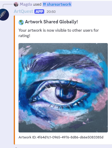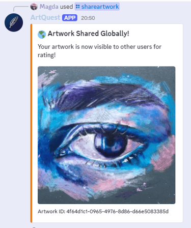 Yes! Use the /shareartwork command to publish your creations globally across all servers using ArtQuest. Other artists can rate your work, helping you earn XP and recognition!